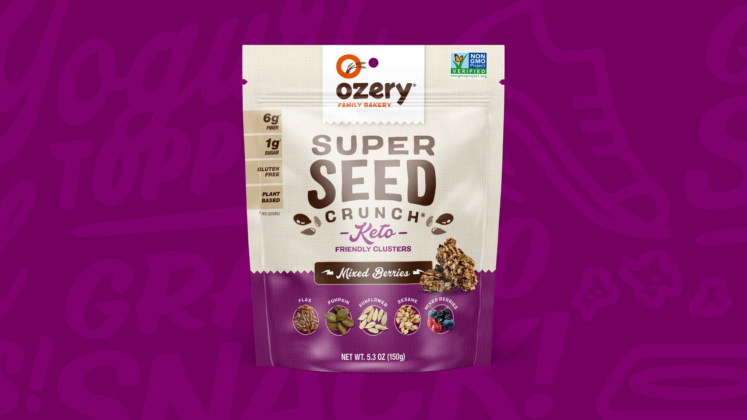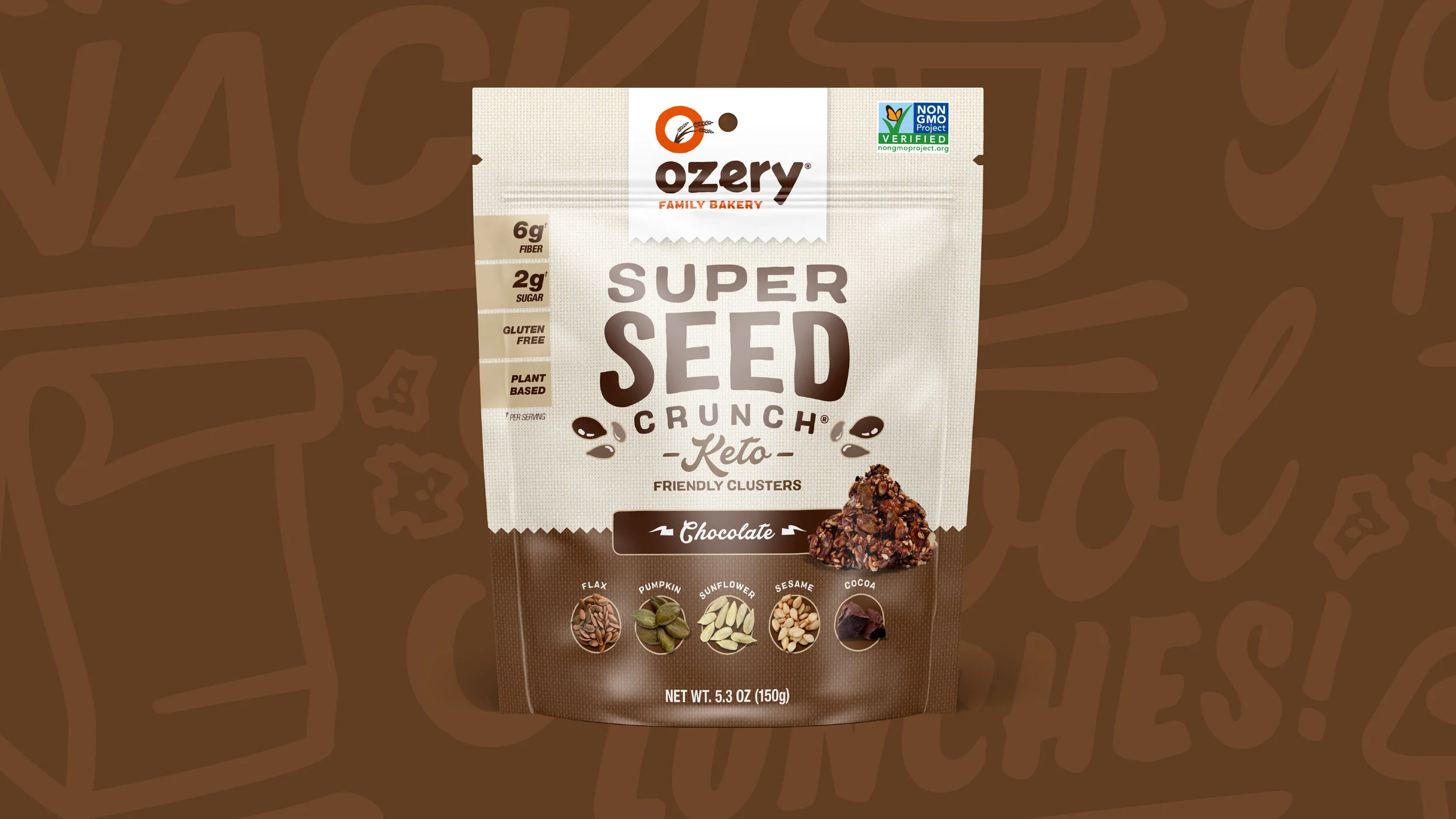 Super Seed Crunch is Ozery’s newest creation, and one of their first products outside of the bread category. Since the actual product was not visible in the opaque plastic pouches, we used photography to showcase the individual clusters and highlight the simple ingredients used to make this tasty keto-friendly snack.
